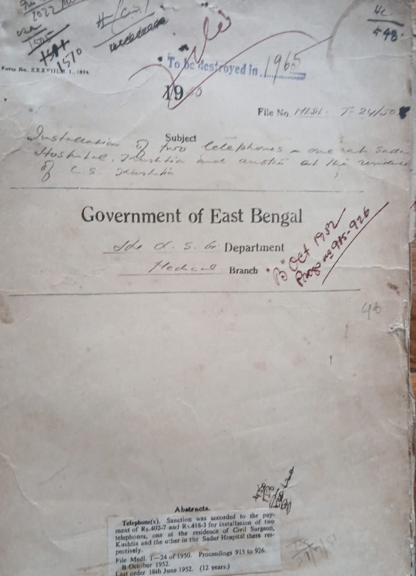 Installation of two telephones, one at the residence of C.S. Kushtia and another at the Sadar Hospital, Kushtia.