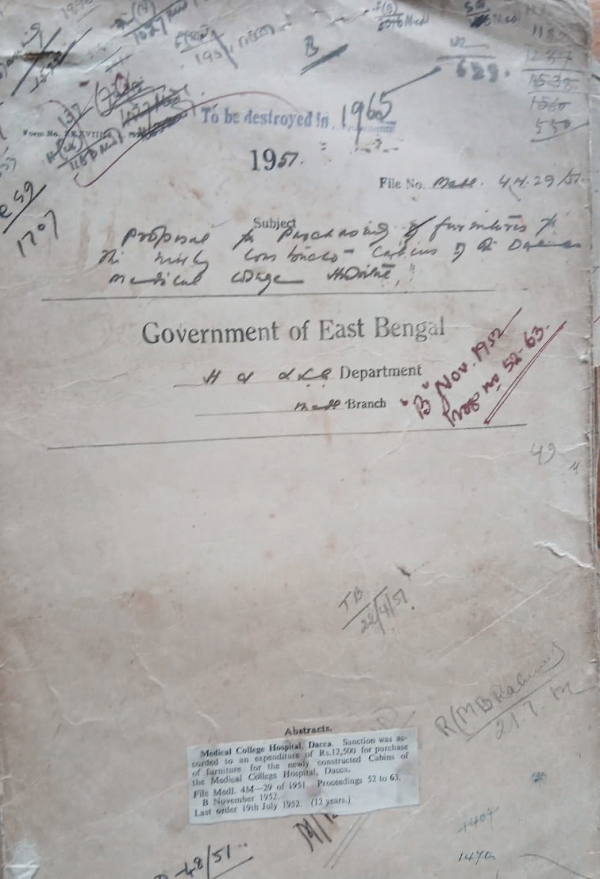 | Rack No. 10, Bundle No. 116 Sl No. 9546 Transfer of central of the budget head "63-B-Dev" to planning department Dacca. | Rack No. 10, Bundle No. 116 Sl No. 9547 Permission to two 2nd year Re-examine students of the D.M.S. to appear in the next Intermediate exam of the S.M.F. as change candidates. | Rack No. 10, Bundle No. 116 Sl No. 9548 Installation of two telephones, one at the residence of C.S. Kushtia and another at the Sadar Hospital, Kushtia. | Rack No. 10, Bundle No. 116 Sl No. 9549 Proposal for purchase of furniture's for the newly constructed cabins of the M.C.H. Dacca. | Rack No. 10, Bundle No. 116 Sl No. 9550 Medical treatment of civilian govt. personnel in Military Hospitals in Pakistan. | Rack No. 10, Bundle No. 116 Sl No. 9551 Water supply arrangement in the Medical School, Chittagong. | Rack No. 10, Bundle No. 116 Sl No. 9552 Providing a pucca compound wall for the R.P's quos. at the North gate attached to the M.C.H. Dacca. |