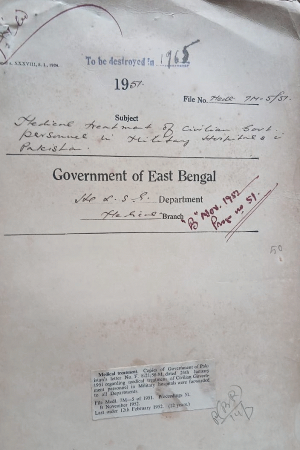 | Rack No. 10, Bundle No. 116 Sl No. 9547 Permission to two 2nd year Re-examine students of the D.M.S. to appear in the next Intermediate exam of the S.M.F. as change candidates. | Rack No. 10, Bundle No. 116 Sl No. 9548 Installation of two telephones, one at the residence of C.S. Kushtia and another at the Sadar Hospital, Kushtia. | Rack No. 10, Bundle No. 116 Sl No. 9549 Proposal for purchase of furniture's for the newly constructed cabins of the M.C.H. Dacca. | Rack No. 10, Bundle No. 116 Sl No. 9550 Medical treatment of civilian govt. personnel in Military Hospitals in Pakistan. | Rack No. 10, Bundle No. 116 Sl No. 9551 Water supply arrangement in the Medical School, Chittagong. | Rack No. 10, Bundle No. 116 Sl No. 9552 Providing a pucca compound wall for the R.P's quos. at the North gate attached to the M.C.H. Dacca. | Rack No. 10, Bundle No. 116 Sl No. 9553 Payment at Rs. 478/- for the advertisement bills. |