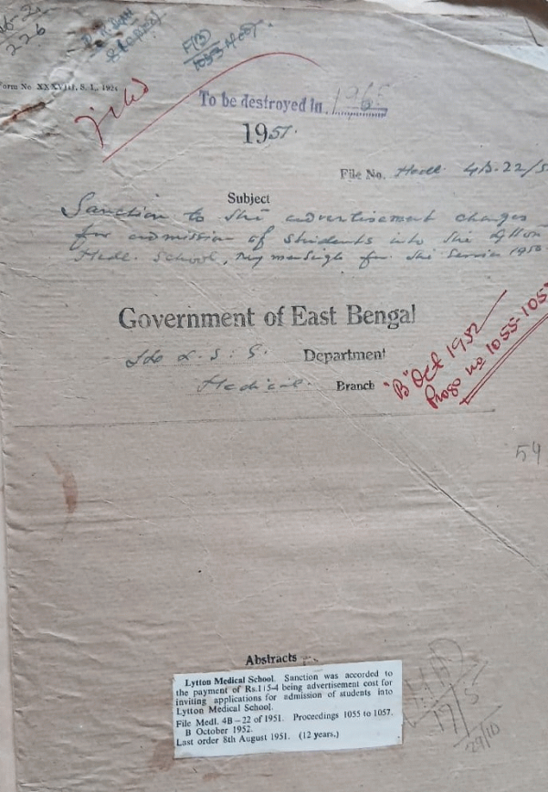 | Rack No. 10, Bundle No. 116 Sl No. 9551 Water supply arrangement in the Medical School, Chittagong. | Rack No. 10, Bundle No. 116 Sl No. 9552 Providing a pucca compound wall for the R.P's quos. at the North gate attached to the M.C.H. Dacca. | Rack No. 10, Bundle No. 116 Sl No. 9553 Payment at Rs. 478/- for the advertisement bills. | Rack No. 10, Bundle No. 116 Sl No. 9554 Advertisement charges in connection with the admission of the students into the Lytton Medical College, Mymensingh. | Rack No. 10, Bundle No. 116 Sl No. 9555 Payment of the arrear bills of M/S. Imperial Chemical Industries (Export) Ltd. & S.M. Hanif (Dacca) Ltd. | Rack No. 10, Bundle No. 116 Sl No. 9556 Sanction of printing charges amounting to Rs. 2/2/8/- | Rack No. 10, Bundle No. 116 Sl No. 9557 Powers to the civil surgeons for writing off the value of stores up to the limit of Rs. 50/- |