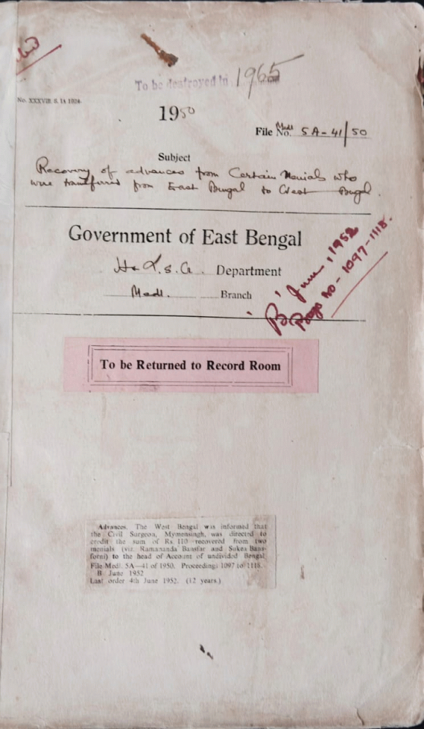 | Rack No. 9, Bundle No. 112, Sl No. 9212 Visit of Dr. C.G. Exner of U.K. in Dacca. | Rack No. 9, Bundle No. 112, Sl No. 9213 Requirement of a list of non-Muslim exposes serving under the govt. of East Pakistan. | Rack No. 9, Bundle No. 112, Sl No. 9214 Sanction for the retention of the staff attached to the ambulance at Chittagong for the year 1950-51. | Rack No. 9, Bundle No. 112, Sl No. 9215 Recovery of advances from certain menials who were transferred from East to West Bengal. | Rack No. 9, Bundle No. 112, Sl No. 9216 Appointment of Dr. Shaikh Mainuddin Ahmed M.B. in the E.P.M.S. (Upper). | Rack No. 9, Bundle No. 112, Sl No. 9217 Confirmation of Dr. Md. Abdur Rahim, Teacher of Medical Jurisprudence Lytton Medical School, Mymensingh in the E.P.M.S. (Upper). | Rack No. 9, Bundle No. 112, Sl No. 9218 Enquiry against Dr. Vall. |