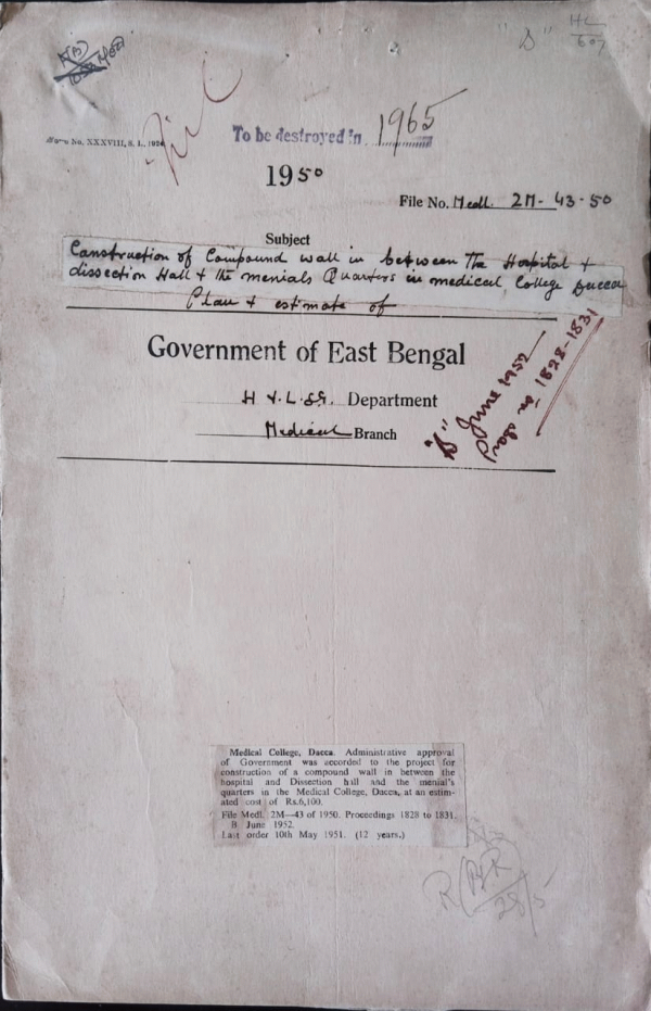 | Rack No. 9, Bundle No. 112, Sl No. 9218 Enquiry against Dr. Vall. | Rack No. 9, Bundle No. 112, Sl No. 9219 Fixation of pay of Dr. A.M. Choudhury Superintendent, D.M.S. and Mitford Hospital. | Rack No. 9, Bundle No. 112, Sl No. 9220 Providing partition walls door, wash hand basin, sink etc in the waiting Shed in out-door Department for accommodation of Dental Surgeon, M.C.H. Dacca. | Rack No. 9, Bundle No. 112, Sl No. 9221 Construction of compound wall in between the hospital and Dissection hall and the menials quarters in Medical College, Dacca. | Rack No. 9, Bundle No. 112, Sl No. 9222 Proposal for re-organization of the female students hostel attached to the D.M.S. | Rack No. 9, Bundle No. 112, Sl No. 9223 Proposal for extra remuneration of Rs. 40/- per month to Dr. Md. Easin Ali for doing double duties. | Rack No. 9, Bundle No. 112, Sl No. 9224 Amalgamation of the Duffer in Hospital with the Mitford hospital. Transfer of building to govt. by a Registered deed. |