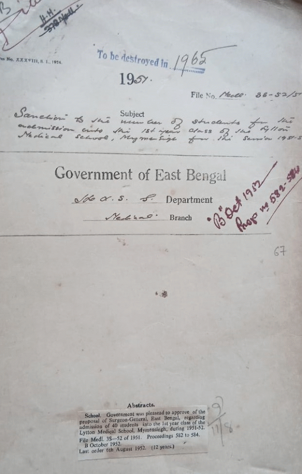 | Rack No. 10, Bundle No. 116 Sl No. 9564 Appointment of Dr. Syed Muzaffar Hossain as Assistant Prof. of Pathology, D.M.C, Vice Dr. Z. Ahmed on higher training abroad. | Rack No. 10, Bundle No. 116 Sl No. 9565 Repairs of A.G. Hospitals through the agency of C.B. Department during (1945-46) Dacca Division. | Rack No. 10, Bundle No. 116 Sl No. 9566 Installation of a telephone in the C.S.'s residence at Faridpur. | Rack No. 10, Bundle No. 116 Sl No. 9567 Sanction to the number of students for the admission into the 1st year class of the Lytton Medical School, Mymensingh for the session 1951-52. | Rack No. 10, Bundle No. 116 Sl No. 9568 Transfer of service records of displaced govt. servants (Migrants). | Rack No. 10, Bundle No. 116 Sl No. 9569 Authentication of the Budget for 1951-52 by H.E. | Rack No. 10, Bundle No. 116 Sl No. 9570 Simplification of the Procedure for the verification of service for pension. |