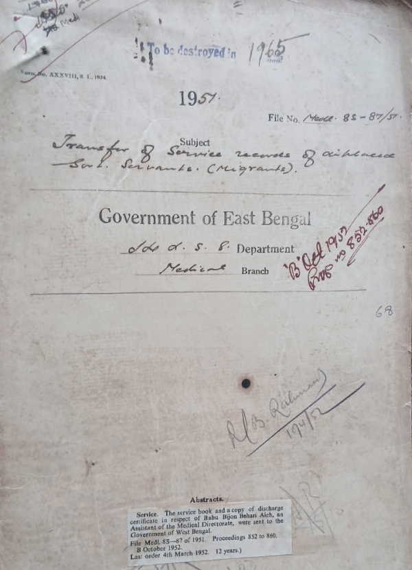 | Rack No. 10, Bundle No. 116 Sl No. 9565 Repairs of A.G. Hospitals through the agency of C.B. Department during (1945-46) Dacca Division. | Rack No. 10, Bundle No. 116 Sl No. 9566 Installation of a telephone in the C.S.'s residence at Faridpur. | Rack No. 10, Bundle No. 116 Sl No. 9567 Sanction to the number of students for the admission into the 1st year class of the Lytton Medical School, Mymensingh for the session 1951-52. | Rack No. 10, Bundle No. 116 Sl No. 9568 Transfer of service records of displaced govt. servants (Migrants). | Rack No. 10, Bundle No. 116 Sl No. 9569 Authentication of the Budget for 1951-52 by H.E. | Rack No. 10, Bundle No. 116 Sl No. 9570 Simplification of the Procedure for the verification of service for pension. | Rack No. 10, Bundle No. 116 Sl No. 9571 Sanction of Advance T.A. to Dr. Syed Nasiruddin Ahemd, R/S. M.C.H. Dacca for deposition in courts. |