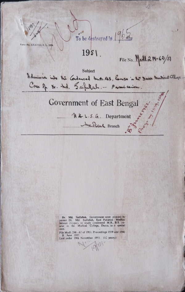 | Rack No. 9, Bundle No. 112, Sl No. 9230 Revision of pay scale of Lab. bearer of the Govt. Tibbiya College, Sylhet. | Rack No. 9, Bundle No. 112, Sl No. 9231 Extra remuneration to Maulvi. Mafizul Islam, 2nd clerk, C.S. office, Dacca for doing double duties. | Rack No. 9, Bundle No. 112, Sl No. 9232 Selection committee for admission of students into the Sylhet Medical School 1950-51. | Rack No. 9, Bundle No. 112, Sl No. 9233 Admission into the condensed M.B.B.S. course in the D.M.C. case of Dr. Md. Saifullah Permission. | Rack No. 9, Bundle No. 112, Sl No. 9234 Payment of arrear bills of Rs. 274/2/- for the year 194849 of thana and outdoor dispensaries in the district of Bakerganj. | Rack No. 9, Bundle No. 112, Sl No. 9235 Sanction of house rent o the Medical Officer of the Wazirpur Thana Dispensary of Bakerganj. | Rack No. 9, Bundle No. 112, Sl No. 9236 Appointment of Dr. M.A. Rahshid, S.K. Guha, M. Hasan, B.K. Paul, Nowab Ali Ahmed and B.M. Basak as A.S. in the E.P.M.S. (Upper). |