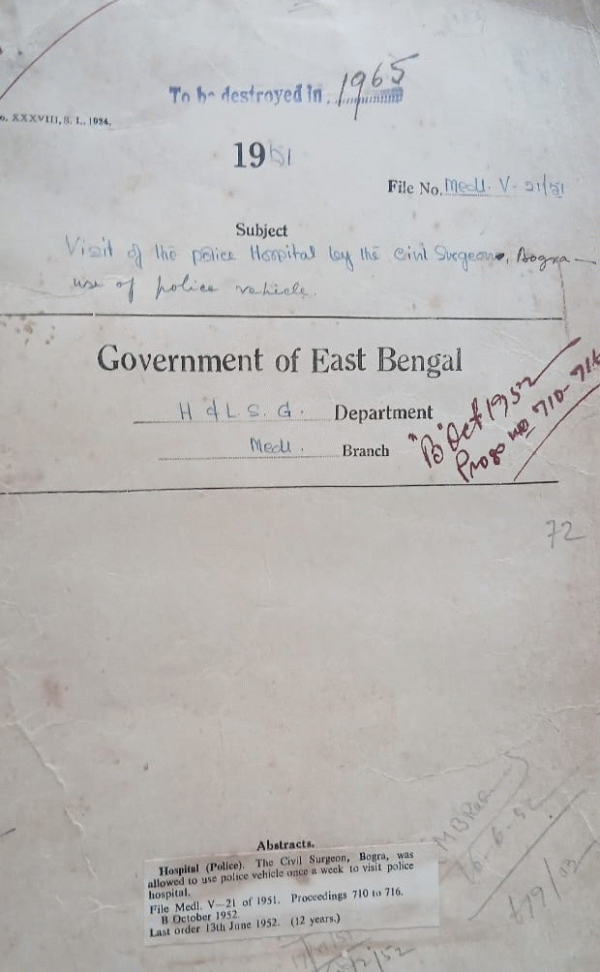 | Rack No. 10, Bundle No. 116 Sl No. 9569 Authentication of the Budget for 1951-52 by H.E. | Rack No. 10, Bundle No. 116 Sl No. 9570 Simplification of the Procedure for the verification of service for pension. | Rack No. 10, Bundle No. 116 Sl No. 9571 Sanction of Advance T.A. to Dr. Syed Nasiruddin Ahemd, R/S. M.C.H. Dacca for deposition in courts. | Rack No. 10, Bundle No. 116 Sl No. 9572 Visit of the Police Hospital by the C/S. Bogra use of Police Vehicle. | Rack No. 10, Bundle No. 116 Sl No. 9573 Retention of the post of part time clerk for the Leper Hospital, Sylhet. | Rack No. 10, Bundle No. 116 Sl No. 9574 Application of Mr. A. Hussain, M.S.c, the 2nd Assistant Chemical Examiner to the Govt. of E.B. for the post of Inspector of Explosives. | Rack No. 10, Bundle No. 116 Sl No. 9575 Admission pay of the Honorary staff of the Sadar and Sub-Divisional Hospitals in E.B. |