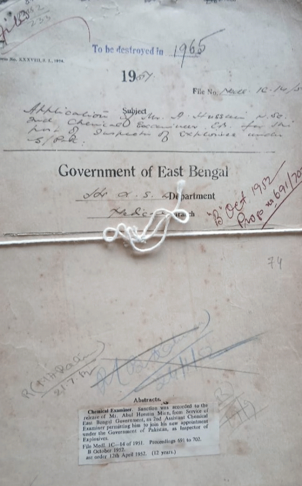 Application of Mr. A. Hussain, M.S.c, the 2nd Assistant Chemical Examiner to the Govt. of E.B. for the post of Inspector of Explosives.