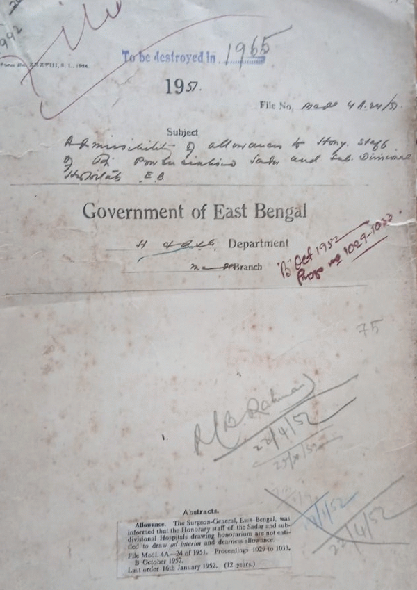 | Rack No. 10, Bundle No. 116 Sl No. 9572 Visit of the Police Hospital by the C/S. Bogra use of Police Vehicle. | Rack No. 10, Bundle No. 116 Sl No. 9573 Retention of the post of part time clerk for the Leper Hospital, Sylhet. | Rack No. 10, Bundle No. 116 Sl No. 9574 Application of Mr. A. Hussain, M.S.c, the 2nd Assistant Chemical Examiner to the Govt. of E.B. for the post of Inspector of Explosives. | Rack No. 10, Bundle No. 116 Sl No. 9575 Admission pay of the Honorary staff of the Sadar and Sub-Divisional Hospitals in E.B. | Rack No. 10, Bundle No. 116 Sl No. 9576 Leave salary of Dr. Fazleh Ahmed (S.A.S.). | Rack No. 10, Bundle No. 116 Sl No. 9577 Repairing of a tube-well in the Dhalghal T.B.S. Hospital, Chittagong. | Rack No. 10, Bundle No. 116 Sl No. 9578 Instruction for purchasing of books from Indian Dominion. |