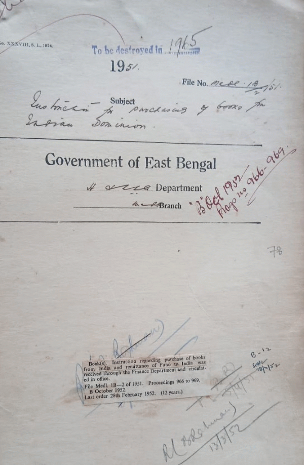 | Rack No. 10, Bundle No. 116 Sl No. 9575 Admission pay of the Honorary staff of the Sadar and Sub-Divisional Hospitals in E.B. | Rack No. 10, Bundle No. 116 Sl No. 9576 Leave salary of Dr. Fazleh Ahmed (S.A.S.). | Rack No. 10, Bundle No. 116 Sl No. 9577 Repairing of a tube-well in the Dhalghal T.B.S. Hospital, Chittagong. | Rack No. 10, Bundle No. 116 Sl No. 9578 Instruction for purchasing of books from Indian Dominion. | Rack No. 10, Bundle No. 116 Sl No. 9579 Payment of provident fund money of Dr. B.C. Paul, Late Pathologist, Provincial Hospital, Naogaon. | Rack No. 10, Bundle No. 116 Sl No. 9580 Appointment of Medical Officer in the Mymensingh District Jail. | Rack No. 10, Bundle No. 116 Sl No. 9581 Supply of copies of G.O. regarding the non-practicing allowance of Rs. 150/- to the post of additional C.S., Faridpur. |