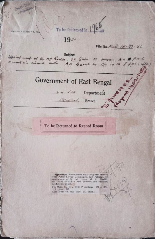 | Rack No. 9, Bundle No. 112, Sl No. 9233 Admission into the condensed M.B.B.S. course in the D.M.C. case of Dr. Md. Saifullah Permission. | Rack No. 9, Bundle No. 112, Sl No. 9234 Payment of arrear bills of Rs. 274/2/- for the year 194849 of thana and outdoor dispensaries in the district of Bakerganj. | Rack No. 9, Bundle No. 112, Sl No. 9235 Sanction of house rent o the Medical Officer of the Wazirpur Thana Dispensary of Bakerganj. | Rack No. 9, Bundle No. 112, Sl No. 9236 Appointment of Dr. M.A. Rahshid, S.K. Guha, M. Hasan, B.K. Paul, Nowab Ali Ahmed and B.M. Basak as A.S. in the E.P.M.S. (Upper). | Rack No. 9, Bundle No. 112, Sl No. 9237 Cash allowance of Dr. S. Ahmed R/S (Eye), M.C.H. Dacca. | Rack No. 9, Bundle No. 112, Sl No. 9238 T.A. bill of Dr. Ibrahim for going his family form Chittagong to Dacca. | Rack No. 9, Bundle No. 112, Sl No. 9239 Rules framed under Medical Practitioners (N.S.) Act 1950. |