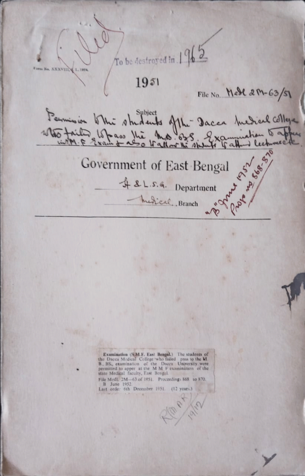 | Rack No. 9, Bundle No. 112, Sl No. 9237 Cash allowance of Dr. S. Ahmed R/S (Eye), M.C.H. Dacca. | Rack No. 9, Bundle No. 112, Sl No. 9238 T.A. bill of Dr. Ibrahim for going his family form Chittagong to Dacca. | Rack No. 9, Bundle No. 112, Sl No. 9239 Rules framed under Medical Practitioners (N.S.) Act 1950. | Rack No. 9, Bundle No. 112, Sl No. 9240 Permission to the Medical Students of the D.M.C. who failed to pass the M.B.B.S. exam to appear with M.M.F. exam of the S.M.F. East Bengal. | Rack No. 9, Bundle No. 112, Sl No. 9241 Reduction of Municipal Contribution towards the Sadar Hospital, Dinajpur. | Rack No. 9, Bundle No. 112, Sl No. 9242 Reduced rate of District Board Contribution to the Meherpur Prov. Hospital, Kushtia. | Rack No. 9, Bundle No. 112, Sl No. 9243 Selection committee for the admission of Students into the Sylhet Medical School for the Sylhet Medical School for the Session 1951-52. |