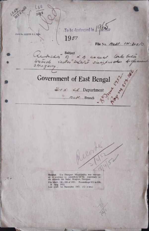 | Rack No. 9, Bundle No. 112, Sl No. 9238 T.A. bill of Dr. Ibrahim for going his family form Chittagong to Dacca. | Rack No. 9, Bundle No. 112, Sl No. 9239 Rules framed under Medical Practitioners (N.S.) Act 1950. | Rack No. 9, Bundle No. 112, Sl No. 9240 Permission to the Medical Students of the D.M.C. who failed to pass the M.B.B.S. exam to appear with M.M.F. exam of the S.M.F. East Bengal. | Rack No. 9, Bundle No. 112, Sl No. 9241 Reduction of Municipal Contribution towards the Sadar Hospital, Dinajpur. | Rack No. 9, Bundle No. 112, Sl No. 9242 Reduced rate of District Board Contribution to the Meherpur Prov. Hospital, Kushtia. | Rack No. 9, Bundle No. 112, Sl No. 9243 Selection committee for the admission of Students into the Sylhet Medical School for the Sylhet Medical School for the Session 1951-52. | Rack No. 9, Bundle No. 112, Sl No. 9244 Posting of Dr. M. Hasan or return from his training in Tuberculosis Control aboard. |