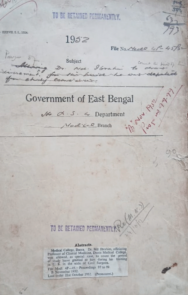 | Rack No. 10, Bundle No. 116 Sl No. 9587 Accommodation of the Medical Stores of the D.H.O., Bakerganj. | Rack No. 10, Bundle No. 116 Sl No. 9588 Appointment of staff for the infectious diseases ward at 18, D.C. Roy Road, attached to the Mitford Hospital, Dacca. | Rack No. 10, Bundle No. 116 Sl No. 9589 Sanction committee to the admission to students in the Chittagong Medical School for the year (1952-53). | Rack No. 10, Bundle No. 116 Sl No. 9590 Fixation of pay of Dr. Md. Ibrahim, MRCR (London) counting his study leave abroad. | Rack No. 10, Bundle No. 116 Sl No. 9591 Instruction regarding the purchase of medicines from the prov. pharmaceutical works. | Rack No. 10, Bundle No. 116 Sl No. 9592 Permission to Dr. A.M. Md. Abdur Rouf, Teacher of Medicine, Dacca Medical School to publish and sell the books written by him on hygiene. | Rack No. 10, Bundle No. 116 Sl No. 9593 Heavy import duties on scientific glass and Sprit. |