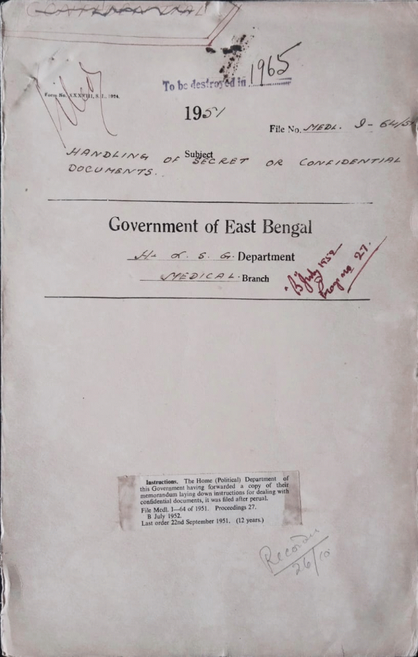 | Rack No. 9, Bundle No. 112, Sl No. 9243 Selection committee for the admission of Students into the Sylhet Medical School for the Sylhet Medical School for the Session 1951-52. | Rack No. 9, Bundle No. 112, Sl No. 9244 Posting of Dr. M. Hasan or return from his training in Tuberculosis Control aboard. | Rack No. 9, Bundle No. 112, Sl No. 9245 Construction of a Medical School into College in E.B. | Rack No. 9, Bundle No. 112, Sl No. 9246 Handing of Secret or confidential Document. | Rack No. 9, Bundle No. 112, Sl No. 9247 Payment of arrear T.A. of Dr. Sekandar Ali, M.O. Chuadanga Prov. Hospital, Kushtia. | Rack No. 9, Bundle No. 112, Sl No. 9248 Retention of the post of P.S. to Honorable Minister, Health & L.S.G. Department. | Rack No. 9, Bundle No. 112, Sl No. 9249 Proposed appointment of Certifying Surgeons under Factories Act, E.B. |