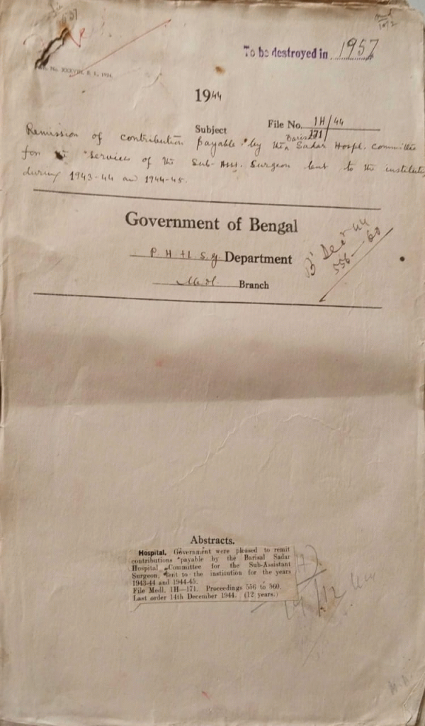 Recovery of contribution from the District Hospital Committee on account of the services of the Sub-Assistant Surgeon bandaged to the Sadar Hospital.