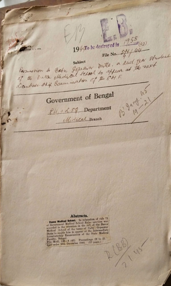 Permission to Babu gopeswar Datta a 2nd year student of the Dacca. Medical School to appear the next licentiateship Examination of the S.M.F.