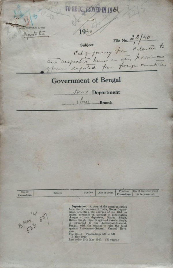 | Rack No. 42, Bundle No. 06, Sl No. 328 Grant of Visa for India to Mr. & Mrs. Vendelin Huilica of Czechoslovak National. | Rack No. 42, Bundle No. 06, Sl No. 329 Recovery of repatriation charges from Mr. Armstrong. | Rack No. 42, Bundle No. 06, Sl No. 330 Dress to be worn by the invitees to the Police Parade Dacca. | Rack No. 42, Bundle No. 06, Sl No. 331 Cost of Journey from Calcutta to their respective houses of persons deported from of foreign countries. | Rack No. 42, Bundle No. 06, Sl No. 332 Procedure to be followed in disciplinary cases in which the conduct of two or more officers in under investigation. | Rack No. 42, Bundle No. 06, Sl No. 333 The resolution of the Corporation of Calcutta recommending full military training for Bengalis & immediate formation of two Bengali regiment. | Rack No. 42, Bundle No. 06, Sl No. 334 Statement regarding action taken by the Govt. on the resolution passed in Council. |