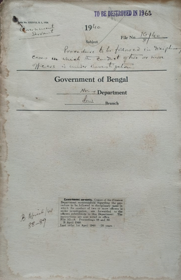 | Rack No. 42, Bundle No. 06, Sl No. 329 Recovery of repatriation charges from Mr. Armstrong. | Rack No. 42, Bundle No. 06, Sl No. 330 Dress to be worn by the invitees to the Police Parade Dacca. | Rack No. 42, Bundle No. 06, Sl No. 331 Cost of Journey from Calcutta to their respective houses of persons deported from of foreign countries. | Rack No. 42, Bundle No. 06, Sl No. 332 Procedure to be followed in disciplinary cases in which the conduct of two or more officers in under investigation. | Rack No. 42, Bundle No. 06, Sl No. 333 The resolution of the Corporation of Calcutta recommending full military training for Bengalis & immediate formation of two Bengali regiment. | Rack No. 42, Bundle No. 06, Sl No. 334 Statement regarding action taken by the Govt. on the resolution passed in Council. | Rack No. 42, Bundle No. 06, Sl No. 335 Calling for a report for the Editor "Matribhumi" in connection with an article entitled "Dr. Debesh Mukerjee". |