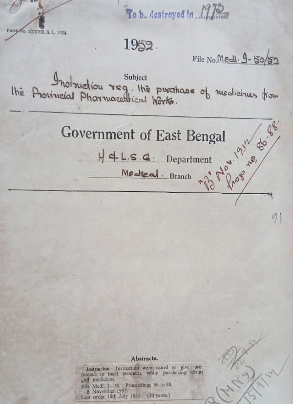 | Rack No. 10, Bundle No. 116 Sl No. 9588 Appointment of staff for the infectious diseases ward at 18, D.C. Roy Road, attached to the Mitford Hospital, Dacca. | Rack No. 10, Bundle No. 116 Sl No. 9589 Sanction committee to the admission to students in the Chittagong Medical School for the year (1952-53). | Rack No. 10, Bundle No. 116 Sl No. 9590 Fixation of pay of Dr. Md. Ibrahim, MRCR (London) counting his study leave abroad. | Rack No. 10, Bundle No. 116 Sl No. 9591 Instruction regarding the purchase of medicines from the prov. pharmaceutical works. | Rack No. 10, Bundle No. 116 Sl No. 9592 Permission to Dr. A.M. Md. Abdur Rouf, Teacher of Medicine, Dacca Medical School to publish and sell the books written by him on hygiene. | Rack No. 10, Bundle No. 116 Sl No. 9593 Heavy import duties on scientific glass and Sprit. | Rack No. 10, Bundle No. 116 Sl No. 9594 Requirements of service records of Habibur Rahman, a daftly, D.M.C.H. from the govt. of W.B. |