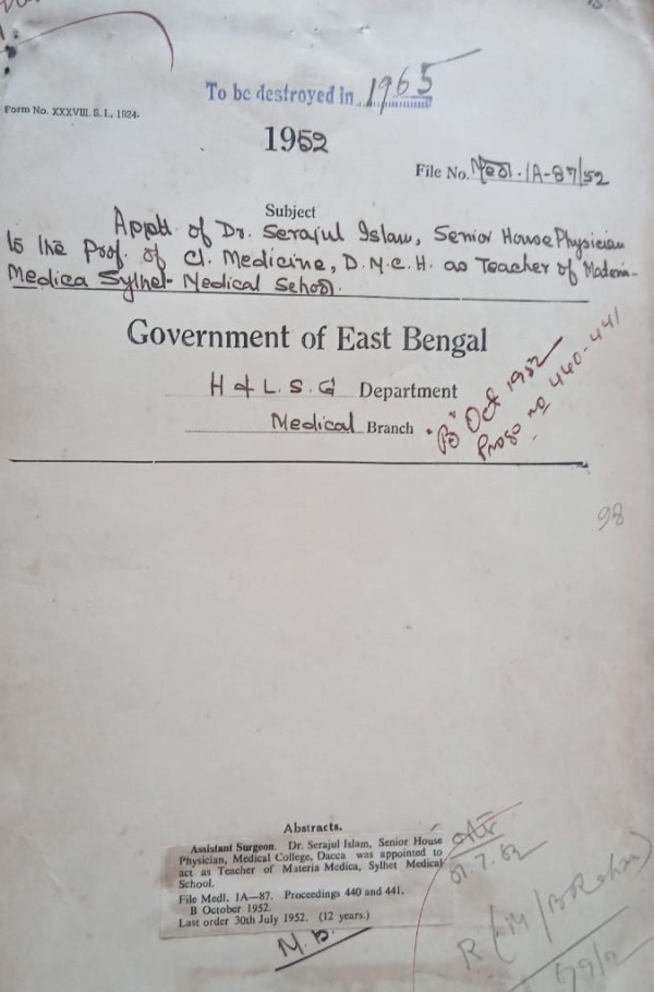 | Rack No. 10, Bundle No. 116 Sl No. 9595 Fixation of pay + Allowance of Dr. K.M. Lutfar Rahman, C/S, Rajshahi. | Rack No. 10, Bundle No. 116 Sl No. 9596 Introduction of contract system in the Mitford Hospital, Dacca for washing Hospital, Clothes. | Rack No. 10, Bundle No. 116 Sl No. 9597 Providing protection walls in the verandah of the general Hospital, Chittagong. | Rack No. 10, Bundle No. 116 Sl No. 9598 Appointment of Dr. Serajul Islam, Senior House Physician to the Prof. of Cl. Medicine, D.M.C.H. as teacher of Material Medical School. | Rack No. 10, Bundle No. 116 Sl No. 9599 Sanction to the purchase of a diary for the C.M.S. Tejgaon. | Rack No. 10, Bundle No. 116 Sl No. 9600 Admission of students into the Sylhet Medical School for the Session 1952-53. | Rack No. 10, Bundle No. 116 Sl No. 9601 Award of Cultural Scholarship to students from other countries in 1952-53. |