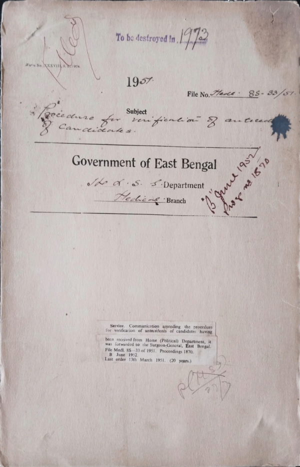 | Rack No. 9, Bundle No. 112, Sl No. 9248 Retention of the post of P.S. to Honorable Minister, Health & L.S.G. Department. | Rack No. 9, Bundle No. 112, Sl No. 9249 Proposed appointment of Certifying Surgeons under Factories Act, E.B. | Rack No. 9, Bundle No. 112, Sl No. 9250 A.Q. by Mr. N.C. Burman M.L.A. regarding power of the Superintendent Mitford Hospital Dacca in the matter of stopping diet of any indoor patient & treatment of Mr. A. M. Chowdhury in Mitford Hospital. | Rack No. 9, Bundle No. 112, Sl No. 9251 Procedure for verification antecedents of Candidates. | Rack No. 9, Bundle No. 112, Sl No. 9252 Repairs to T.B. Seg. Hospital at Muktagacha Road, Mymensingh. | Rack No. 9, Bundle No. 112, Sl No. 9253 Purchase of a type-writer for civil surgeons office, Rajshahi. | Rack No. 9, Bundle No. 112, Sl No. 9254 Revised budget estimates for the years (1951-52) & (1952-53). |