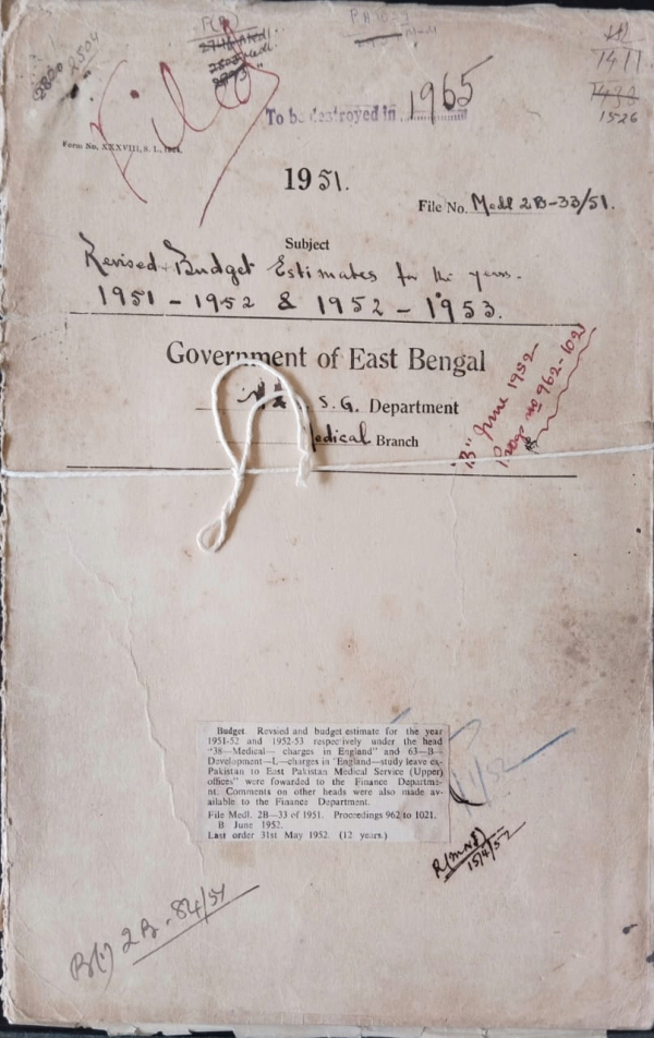 | Rack No. 9, Bundle No. 112, Sl No. 9251 Procedure for verification antecedents of Candidates. | Rack No. 9, Bundle No. 112, Sl No. 9252 Repairs to T.B. Seg. Hospital at Muktagacha Road, Mymensingh. | Rack No. 9, Bundle No. 112, Sl No. 9253 Purchase of a type-writer for civil surgeons office, Rajshahi. | Rack No. 9, Bundle No. 112, Sl No. 9254 Revised budget estimates for the years (1951-52) & (1952-53). | Rack No. 9, Bundle No. 112, Sl No. 9255 Sanction of a monthly advance to Mr. Walhid Burhani a medical student from Syria to be adjusted against the school ship awarded to him by Pakistan Govt. | Rack No. 9, Bundle No. 112, Sl No. 9256 Posting arrangement of Dr. Md. Abdul Rahman, Dr. Tazul Hossain & Dr. Abdus Sobhan Chowdhury. | Rack No. 9, Bundle No. 112, Sl No. 9257 Return of service books and service records of the male nurses to the govt. of E.B. |