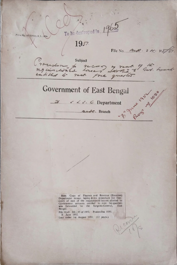 | Rack No. 9, Bundle No. 112, Sl No. 9256 Posting arrangement of Dr. Md. Abdul Rahman, Dr. Tazul Hossain & Dr. Abdus Sobhan Chowdhury. | Rack No. 9, Bundle No. 112, Sl No. 9257 Return of service books and service records of the male nurses to the govt. of E.B. | Rack No. 9, Bundle No. 112, Sl No. 9258 Sanction to the payment of the arrear bill for the supply of liveries to the menials of the Dacca Medical School. | Rack No. 9, Bundle No. 112, Sl No. 9259 Procedure for recovery of rent of the requisitioned house allotted to Govt. Servants entitled to rent free quarters. | Rack No. 9, Bundle No. 112, Sl No. 9260 Arrear pay of Dr. Sultan Ahmed Chowdhury. | Rack No. 9, Bundle No. 112, Sl No. 9261 Appointment of Dr. Shah Fazlul Haq Chowdhury as an A/S. of the E.P.M.S. (Upper). | Rack No. 9, Bundle No. 112, Sl No. 9262 Repairs to small-pox shed at Rangamati in Chittagong Hill Tracts. |
