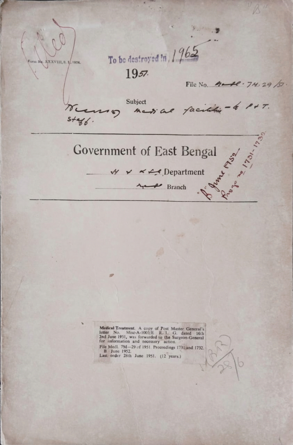 | Rack No. 9, Bundle No. 112, Sl No. 9271 Extension of Kitchen in nurses quarters certain addition and alteration in connection with an alteration in connection with separation of male and female wards + extension of bath etc. of the D.M.C. | Rack No. 9, Bundle No. 112, Sl No. 9272 Appointment of the Assistant Surgeon, Tangail Sub-Division as Medical Officer of the Kumidini College, Tangail. | Rack No. 9, Bundle No. 112, Sl No. 9273 Procedure for the disposal of unserviceable govt. vehicles. | Rack No. 9, Bundle No. 112, Sl No. 9274 Necessary Medical facilities to P & T staff. | Rack No. 9, Bundle No. 112, Sl No. 9275 Confirmation of Dr. Md. Mostafa as M. O., V. D. Clinic, Comilla. | Rack No. 9, Bundle No. 112, Sl No. 9276 Purchase of Mag Sulph. Without calling for quotations for the use of the Medical Patients. | Rack No. 9, Bundle No. 112, Sl No. 9277 Posting of Dr. Altafuddin Ahmed as Civil Surgeon, Khulna. |
