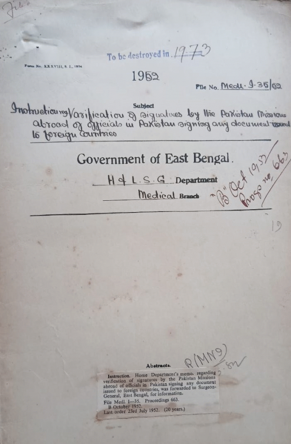 | Rack No. 10, Bundle No. 116 Sl No. 9606 Information regarding the drawls of pay of C/S. & others during the period of their leave. | Rack No. 10, Bundle No. 116 Sl No. 9607 Revision the pay scale of Mvi. Saidur Rahman, Clerk V.D. Clinic, Mitford Hospital, Dacca. | Rack No. 10, Bundle No. 116 Sl No. 9608 Sanction of special pay of Dr. M.N. Ameen's A.S., Central Medical Store, Narayanganj. | Rack No. 10, Bundle No. 116 Sl No. 9609 Requisition of a House for accommodation of Cholera Cases 18, D.C. Roy Road, Dacca. | Rack No. 10, Bundle No. 116 Sl No. 9610 Dental Education & Organization of a Dental Service in E.B. | Rack No. 10, Bundle No. 116 Sl No. 9611 Payment of the arrear municipal tax on the Sadar Hospital building, Barisal for the session from 1-4-48 to 31-3-52. | Rack No. 10, Bundle No. 116 Sl No. 9612 Posting of Dr. Mohiuddin Ahmed, Wakil Ahmed and Siddique Mian. |