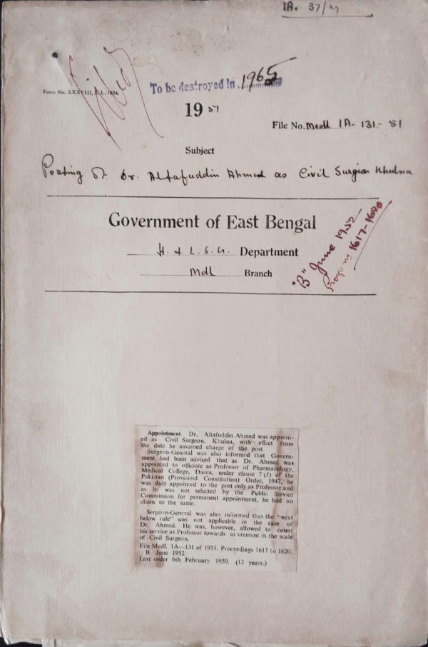 | Rack No. 9, Bundle No. 112, Sl No. 9274 Necessary Medical facilities to P & T staff. | Rack No. 9, Bundle No. 112, Sl No. 9275 Confirmation of Dr. Md. Mostafa as M. O., V. D. Clinic, Comilla. | Rack No. 9, Bundle No. 112, Sl No. 9276 Purchase of Mag Sulph. Without calling for quotations for the use of the Medical Patients. | Rack No. 9, Bundle No. 112, Sl No. 9277 Posting of Dr. Altafuddin Ahmed as Civil Surgeon, Khulna. | Rack No. 9, Bundle No. 112, Sl No. 9278 Creation of a post of Assistant of Pharmacology in the Medical College, Dacca. | Rack No. 9, Bundle No. 112, Sl No. 9279 Purchase of two clock for the Medical Directorate. | Rack No. 9, Bundle No. 112, Sl No. 9280 Opening of a new detailed head under "63-B Development programme Charges in England" |