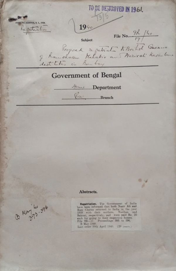 Repatriation of British Guisana of Ram Charan & Nazir ALi in Bombay.