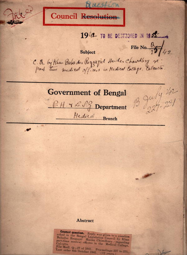C.Q. by Khan Bahadur Rezzaqul Haider Chowdhury regarding Part-time medical officers in Medical College, Calcutta.
