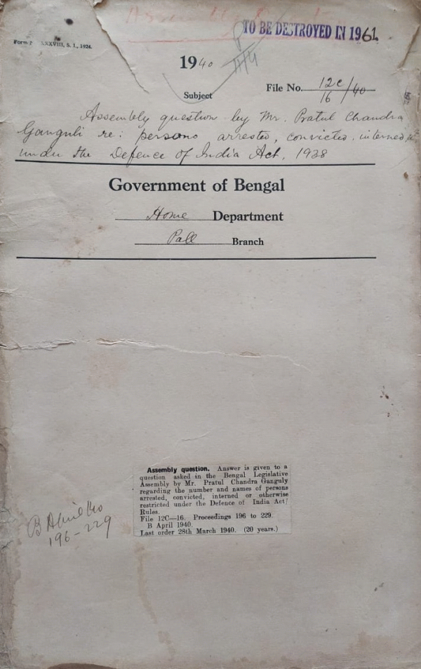 Assembly Question by Mr. Pratul Chandra Ganguly regarding the number & names of persons arrested, convicted, interred or otherwise restricted under the Defense of India Act Rules.