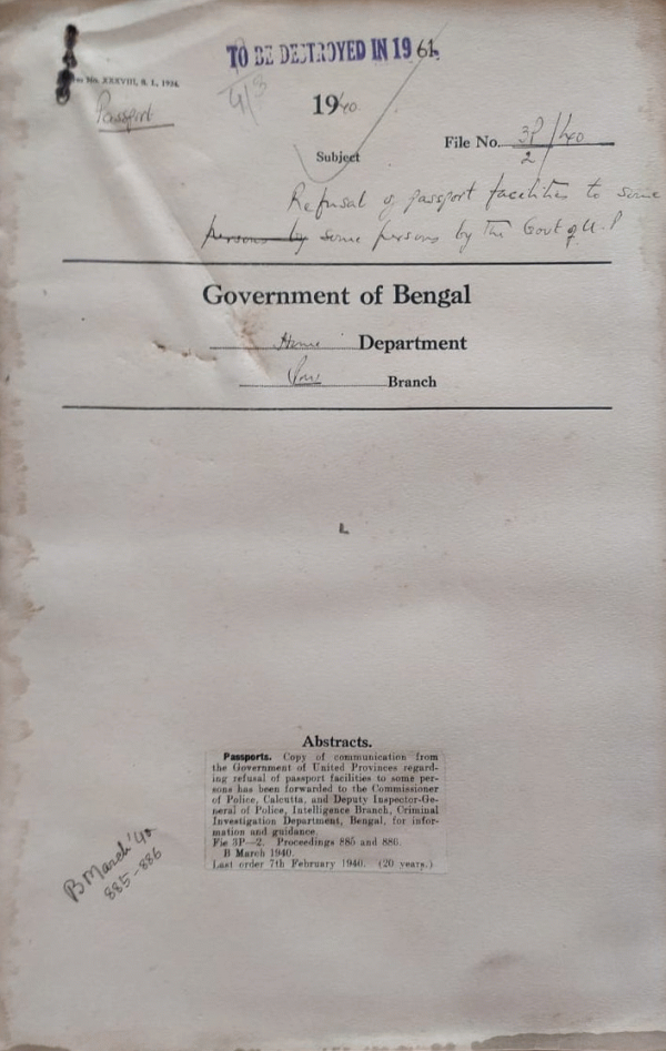 | Rack No. 42, Bundle No. 06, Sl No. 361 Estate of late Jit Bahadur Kami who died at Baghdad. | Rack No. 42, Bundle No. 06, Sl No. 362 Recovery of the amount advanced by his Majestys Consul, Port Said, to Mr. Saura Kumar Chowdhury. | Rack No. 42, Bundle No. 06, Sl No. 363 Refusal of Passport to some persons by the Govt. of the Punjab. | Rack No. 42, Bundle No. 06, Sl No. 364 Refusal of Passport to some persons by the Govt. of U.P. | Rack No. 42, Bundle No. 06, Sl No. 365 Proposed grant of Visa for India to Miss. M.P. Zummerman Dutch National. | Rack No. 42, Bundle No. 06, Sl No. 366 Visa requirement of British Subjects travelling from India to the U.K. | Rack No. 42, Bundle No. 06, Sl No. 367 Grant of a single journey emergency certificate to Mohammad Khan, Guard Hongkong Prison Department. |