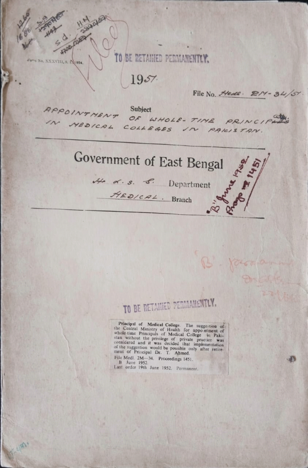 | Rack No. 9, Bundle No. 112, Sl No. 9282 Promotion of Dr. Abdur Samad Mia (1) S.A.S. Jhenidah Prov. Hospital, Jessore as the rank of Assistant Surgeon. | Rack No. 9, Bundle No. 112, Sl No. 9283 Constitution of a Selection committee for the admission of the students in the D.M.S. for the year 1951-52. | Rack No. 9, Bundle No. 112, Sl No. 9284 Selection committee for the admission of students into the Chittagong Medical School for the Session 1951-52. | Rack No. 9, Bundle No. 112, Sl No. 9285 Appointment of whole time principal in Medical Colleges in Pakistan. | Rack No. 9, Bundle No. 112, Sl No. 9286 Rent for the house occupied by the Toke Govt. out-doors Dispensary, Dacca. | Rack No. 9, Bundle No. 112, Sl No. 9287 Creation of a post of menial in the X-ray Department Sadar Hospital, Khulna. | Rack No. 9, Bundle No. 112, Sl No. 9288 Creation of two posts of Panka Pullers in the Sadar Hospital, Kushtia. |