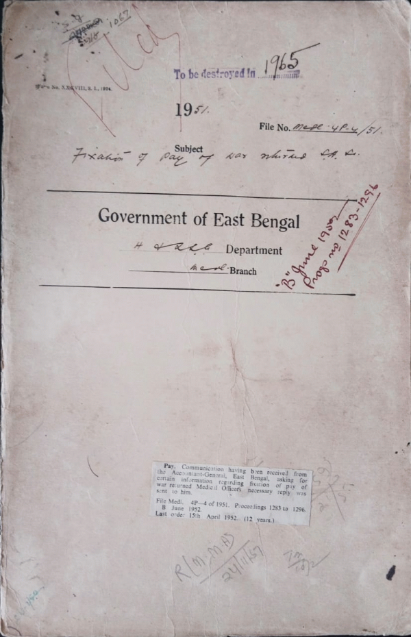 | Rack No. 9, Bundle No. 112, Sl No. 9293 Supply of Human blood Plasma free of cost to the indoor indigent patient of S.K. Hospital, Mymensingh. | Rack No. 9, Bundle No. 112, Sl No. 9293 Creation of a post of Typist Cum Clerk in the office of the Civil Surgeon of Rangpur. | Rack No. 9, Bundle No. 112, Sl No. 9294 Providing Iron Gratings for the windows of the Mortuary Collar plant room of the Anatomy Department, D.M.C. | Rack No. 9, Bundle No. 112, Sl No. 9295 Fixation of pay of war returned M. O. | Rack No. 9, Bundle No. 112, Sl No. 9296 Further education and training for demobilized personnel. | Rack No. 9, Bundle No. 112, Sl No. 9297 Admissibility of dearness allowance to both husband and wife serving under Govt. at the Same Station in non gazetted Posts. | Rack No. 9, Bundle No. 112, Sl No. 9298 Pakistan Central Medical Service Constitution of |