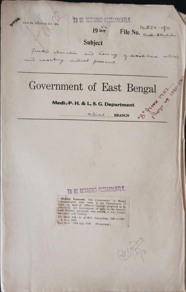 | Rack No. 9, Bundle No. 112, Sl No. 9293 Creation of a post of Typist Cum Clerk in the office of the Civil Surgeon of Rangpur. | Rack No. 9, Bundle No. 112, Sl No. 9294 Providing Iron Gratings for the windows of the Mortuary Collar plant room of the Anatomy Department, D.M.C. | Rack No. 9, Bundle No. 112, Sl No. 9295 Fixation of pay of war returned M. O. | Rack No. 9, Bundle No. 112, Sl No. 9296 Further education and training for demobilized personnel. | Rack No. 9, Bundle No. 112, Sl No. 9297 Admissibility of dearness allowance to both husband and wife serving under Govt. at the Same Station in non gazetted Posts. | Rack No. 9, Bundle No. 112, Sl No. 9298 Pakistan Central Medical Service Constitution of | Rack No. 9, Bundle No. 112, Sl No. 9299 Special pay to the Superintendent Rangpur Jail for holding both executive and Medical Charges of Rangpur Jail. |