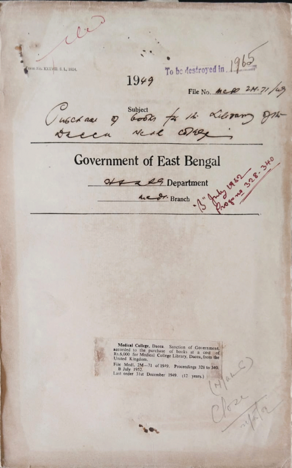 | Rack No. 09, Bundle No. 99, SI No. 7779 Grant of priority to the Baptis mission Hospital Chandraghona (Chittagong Hill tracts) for supply of drugs. | Rack No. 09, Bundle No. 99, SI No. 7780 Grant of six scholarships to the student of the Tibbia Habibia College Dacca. | Rack No. 10, Bundle No. 113, Sl No. 9301 Pay of Khandaker Fazlul Haque and Mvi. Ahsan Ali, Technician , Medical College, Dacca | Rack No. 10, Bundle No. 113, Sl No. 9302 Enclosed of Book for the Library of the Dacca Medical College | Rack No. 10, Bundle No. 113, Sl No. 9303 Grants of Local Board Dispensaries for the year 1949-50 | Rack No. 10, Bundle No. 113, Sl No. 9304 Revised estimate for repairs etc. to the T.B. segregation Hospital at Nishindra, Bogra | Rack No. 10, Bundle No. 113, Sl No. 9305 Realization of cabin rent form Maulvi Mazharul Haque, M.L.A.a patient in the Medical, Dacca |