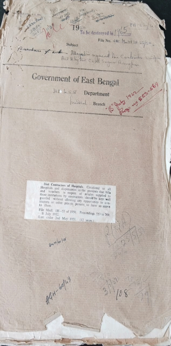 | Rack No. 10, Bundle No. 113, Sl No. 9304 Revised estimate for repairs etc. to the T.B. segregation Hospital at Nishindra, Bogra | Rack No. 10, Bundle No. 113, Sl No. 9305 Realization of cabin rent form Maulvi Mazharul Haque, M.L.A.a patient in the Medical, Dacca | Rack No. 10, Bundle No. 113, Sl No. 9306 Sanction or printing charge of amounting to Rs.2/2/8/ | Rack No. 10, Bundle No. 113, Sl No. 9307 Allegation against the diet contractor of the Saidpur A.G. Hospital | Rack No. 10, Bundle No. 113, Sl No. 9308 Providing wall almirahs with sliding doors in the library of Dacca Medical College. | Rack No. 10, Bundle No. 113, Sl No. 9309 Sanction for purchasing furniture for the use in the different Department of Dacca Medical College amounting to Rs. 11000/- | Rack No. 10, Bundle No. 113, Sl No. 9310 Salaries of S.A.S. employed in the Thana Dispensaries |