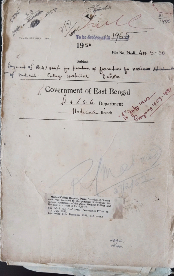 | Rack No. 10, Bundle No. 113, Sl No. 9306 Sanction or printing charge of amounting to Rs.2/2/8/ | Rack No. 10, Bundle No. 113, Sl No. 9307 Allegation against the diet contractor of the Saidpur A.G. Hospital | Rack No. 10, Bundle No. 113, Sl No. 9308 Providing wall almirahs with sliding doors in the library of Dacca Medical College. | Rack No. 10, Bundle No. 113, Sl No. 9309 Sanction for purchasing furniture for the use in the different Department of Dacca Medical College amounting to Rs. 11000/- | Rack No. 10, Bundle No. 113, Sl No. 9310 Salaries of S.A.S. employed in the Thana Dispensaries | Rack No. 10, Bundle No. 113, Sl No. 9311 Appointment of a part-time Clerk Bagherhat Provincialized Hospital, Khulna | Rack No. 10, Bundle No. 113, Sl No. 9312 Recovery of the amount of Rs. 94/- from Dr. S.N. Sengupta Lali Hong, Pathologist sadar Hospital |
