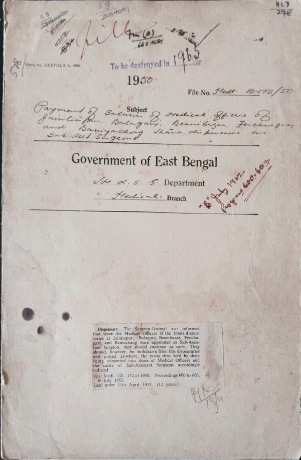 | Rack No. 10, Bundle No. 113, Sl No. 9307 Allegation against the diet contractor of the Saidpur A.G. Hospital | Rack No. 10, Bundle No. 113, Sl No. 9308 Providing wall almirahs with sliding doors in the library of Dacca Medical College. | Rack No. 10, Bundle No. 113, Sl No. 9309 Sanction for purchasing furniture for the use in the different Department of Dacca Medical College amounting to Rs. 11000/- | Rack No. 10, Bundle No. 113, Sl No. 9310 Salaries of S.A.S. employed in the Thana Dispensaries | Rack No. 10, Bundle No. 113, Sl No. 9311 Appointment of a part-time Clerk Bagherhat Provincialized Hospital, Khulna | Rack No. 10, Bundle No. 113, Sl No. 9312 Recovery of the amount of Rs. 94/- from Dr. S.N. Sengupta Lali Hong, Pathologist sadar Hospital | Rack No. 10, Bundle No. 113, Sl No. 9313 Realization of subscriptions for the Thana Dispensaries |