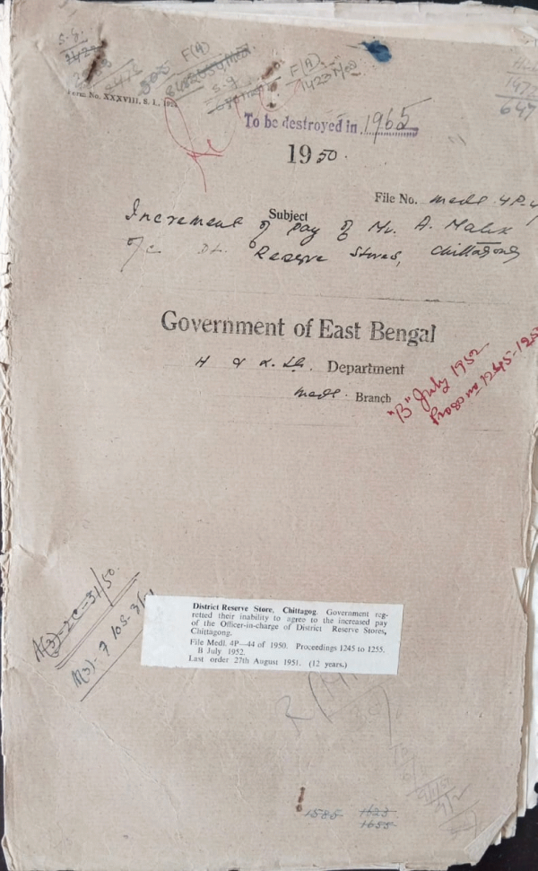 | Rack No. 10, Bundle No. 113, Sl No. 9315 Notice U/S 80 C.P.C. for rent compensation for Rs. 332/2 for the compensation of the Trail A.G. Hospital in the District of Mymensingh. | Rack No. 10, Bundle No. 113, Sl No. 9316 Acceptance of custom for the goods arrived from U.S.A. and U.K. | Rack No. 10, Bundle No. 113, Sl No. 9317 Arrear of Md. Khorshed Hossain, Ex-packer, D.R.S. Khulna | Rack No. 10, Bundle No. 113, Sl No. 9318 Grant of extra allowance to Mr. A. Malek, O/C, D.R.S. Chittagong | Rack No. 10, Bundle No. 113, Sl No. 9319 Purchase of articles for use in the Pharmacology Department in Dacca Medical College | Rack No. 10, Bundle No. 113, Sl No. 9320 Special pay of the Medical Officers of the Rural Dispensaries of Sylhet District | Rack No. 10, Bundle No. 113, Sl No. 9321 Appointment of Md. Wajed Ali as Officer-in-charge of District Reserve Store, Mymensingh |