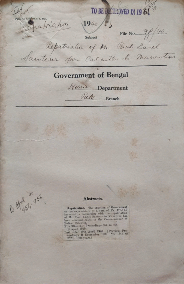 Repatriation of Mr. Paul Lanel Santeur from Calcutta to Mauritius.