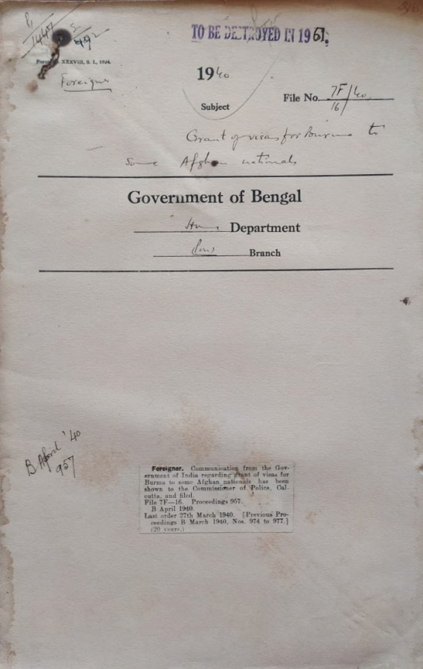 | Rack No. 42, Bundle No. 06, Sl No. 385 Refusal of passport to Syed Mohd. Ali Nazi. | Rack No. 42, Bundle No. 06, Sl No. 386 Grant of passport facilities to British Subjects for Iran. | Rack No. 42, Bundle No. 06, Sl No. 387 Repatriation of Mr. Paul Lanel Santeur from Calcutta to Mauritius. | Rack No. 42, Bundle No. 06, Sl No. 388 Grant of Visa for Burma to some Afghan Nationals. | Rack No. 42, Bundle No. 06, Sl No. 389 Grant of Visa for India to Mr. R.W. Koiter, a Netherland Subject to enable him to join the electric lamp Manufacturers (India) Ltd. | Rack No. 42, Bundle No. 07, Sl No. 390 Creation of a temporary post of Muharrir in the Judicial Department. | Rack No. 42, Bundle No. 07, Sl No. 391 National Identity of Shaik Liacal Hosen of Hooghly. |
