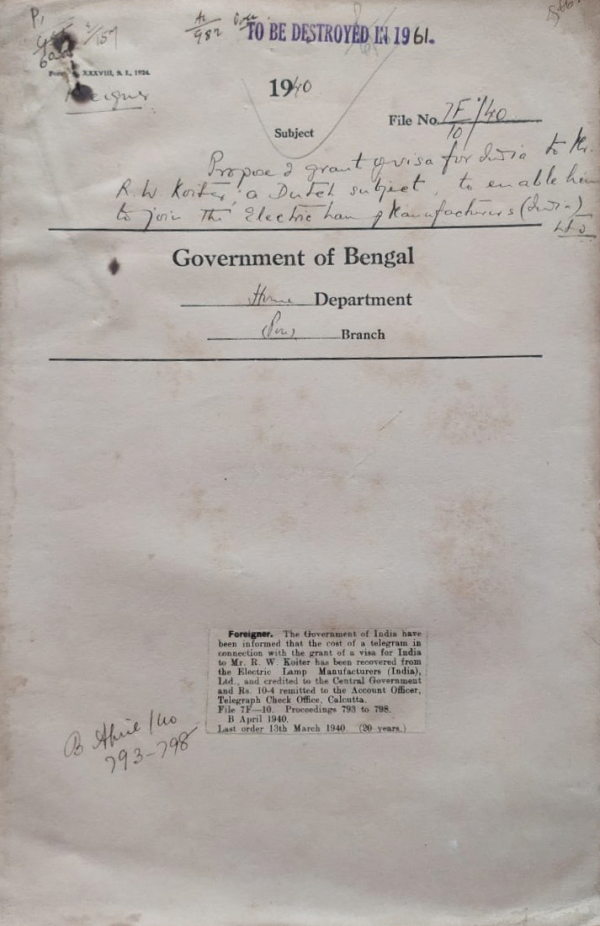 Grant of Visa for India to Mr. R.W. Koiter, a Netherland Subject to enable him to join the electric lamp Manufacturers (India) Ltd.