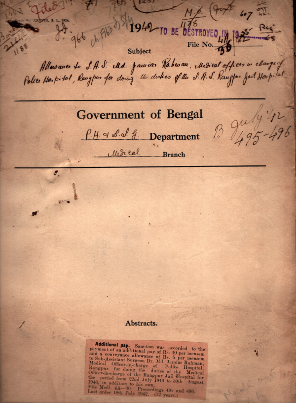 | Rack No. 09; Bundle No. 91 SL No. 7048 Extension of the temporary stuff entertain in connect connection with war is S.G's office. | Rack No. 09; Bundle No. 91 SL No. 7049 High Commissioner budget Receipts and disbursement for the month march 1942. | Rack No. 09; Bundle No. 91 SL No. 7050 Appointment of Dr. Sachindra Nath Roy as Senior Demonstrator of Practical Pharmacy medical college hospital. | Rack No. 09; Bundle No. 91 SL No. 7051 Allowance to S.A.S. Mr. Jamian Rahman Medical Officers in charge of Police Hospital Rangpur doing the duties as the S.A.S. Rangpur Jail Hospital. | Rack No. 09; Bundle No. 91 SL No. 7052 A comprehensive rule of the S.K. hospital Mymensingh. | Rack No. 09; Bundle No. 91 SL No. 7053 Deputation of one Sub. Assistant Surgeon to the Mathematical instrument office. | Rack No. 09; Bundle No. 91 SL No. 7054 Exodus allowance to members of the Clerical establishment and menials except the contingency menials of offices removed outside their normal stations. |
