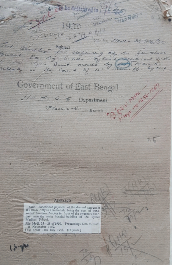 | Rack No. 10, Bundle No. 117 Sl No. 9652 Allotment of funds for repairing the X-ray Machine of the Sadar Hospital, Rangpur. | Rack No. 10, Bundle No. 117 Sl No. 9653 Regarding repairs to the ambulances and truck. | Rack No. 10, Bundle No. 117 Sl No. 9654 Revised pay scale of the Menially attached of the preliminary training school, Dacca. | Rack No. 10, Bundle No. 117 Sl No. 9655 M.S. No. 31 of 1950 Hasib Ullah in the court of 1st Mensiff Sylhet. | Rack No. 10, Bundle No. 117 Sl No. 9656 Sanction for the retention of 12 temporary posts of Female atter. at the Civil Hospital, Sylhet for a further period of one's year from 1.3.49. | Rack No. 10, Bundle No. 117 Sl No. 9657 Purchase of a Gestenther Rotary Duplicator for the Dacca Medical School. | Rack No. 10, Bundle No. 117 Sl No. 9658 Consumption of petrel for motor trucks attached to the central Medical Stores, Tejgaon, and Dacca. |