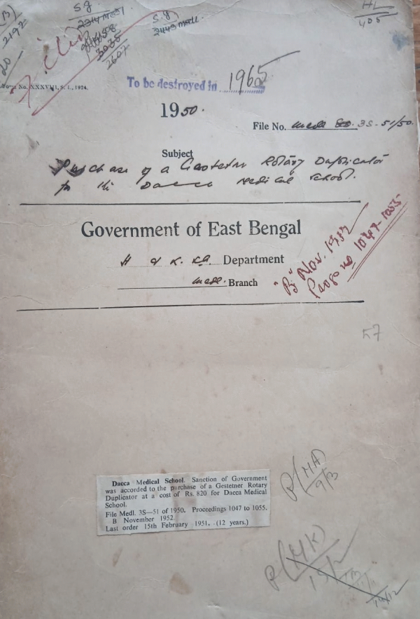 Purchase of a Gestenther Rotary Duplicator for the Dacca Medical School.