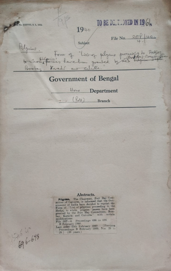| Rack No. 42, Bundle No. 07, Sl No. 396 Application from Dr. Hans Beck's German Nation, for the redialing of his visa for India. | Rack No. 42, Bundle No. 07, Sl No. 397 Disposal of the Property of the Deoli Detention Jail. | Rack No. 42, Bundle No. 07, Sl No. 398 Haj Pilgrims shipping arrangements Reports 1938-39. | Rack No. 42, Bundle No. 07, Sl No. 399 Printing from of "List of Pilgrims Proceeding to the Hedja to whom passes have been granted by Pilgrim Department, Calcutta. | Rack No. 42, Bundle No. 07, Sl No. 400 Rates of Visa fees to be charged in India. | Rack No. 42, Bundle No. 07, Sl No. 401 Refusal of Passport facilities to Mohammad Rafi for Japan. | Rack No. 42, Bundle No. 07, Sl No. 402 Refund of the Sum of 500/- to Hari Gopal Barat Deposited by him for his repatriation charges for Eden Burgh. |