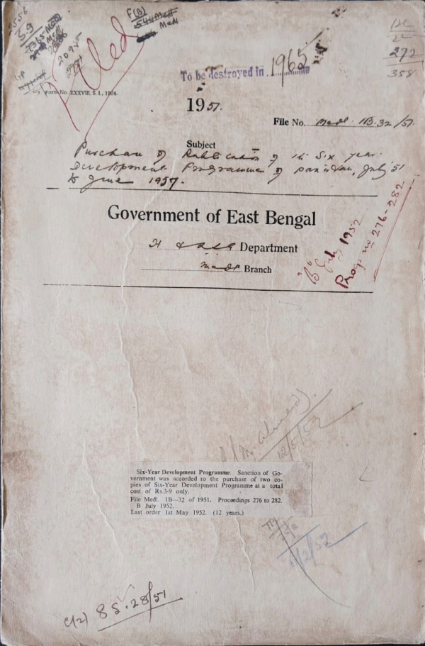 | Rack No. 10, Bundle No. 113, Sl No. 9319 Purchase of articles for use in the Pharmacology Department in Dacca Medical College | Rack No. 10, Bundle No. 113, Sl No. 9320 Special pay of the Medical Officers of the Rural Dispensaries of Sylhet District | Rack No. 10, Bundle No. 113, Sl No. 9321 Appointment of Md. Wajed Ali as Officer-in-charge of District Reserve Store, Mymensingh | Rack No. 10, Bundle No. 113, Sl No. 9322 Purchase of Publication of the Six Year Development Programme of Pakistan | Rack No. 10, Bundle No. 113, Sl No. 9323 Mental patients Exchange between Pakistan and India | Rack No. 10, Bundle No. 113, Sl No. 9324 Maintenance charge of the mental patient Birendra Kumar Dhar belonging to Pakistan Dominion | Rack No. 10, Bundle No. 113, Sl No. 9325 Entertainment of a Head Clerk for the Office of the Superintendent Civil Hospital, Sylhet Sanction |
